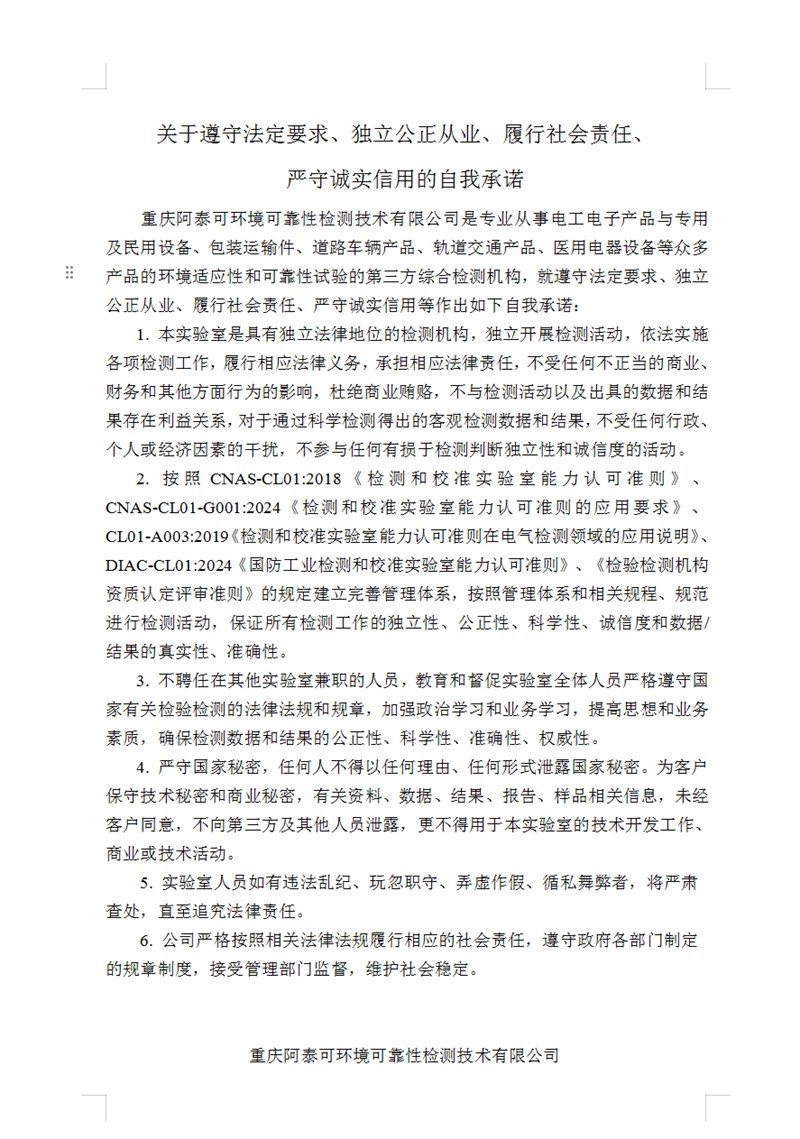 關(guān)于遵守法定要求、獨(dú)立公正從業(yè)、履行社會(huì)責(zé)任、 嚴(yán)守誠(chéng)實(shí)信用的自我承諾